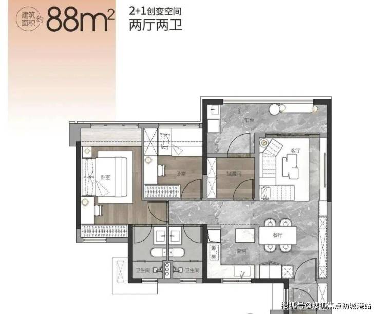 建面约88平是三房两卫户型,竖厅设计,四开间朝南+LDKB超大方厅,有一个入户花园。