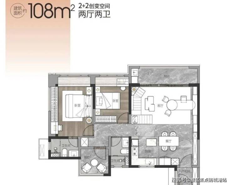 建面约108平是四房两卫户型,四开间朝南,竖厅设计,有一个入户花园,客厅有5.5米宽,可以改造多了一个房,特点是比88平多了一个阳改房。