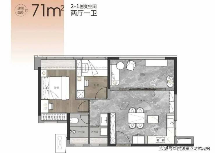 建面约71平是两房一卫户型,5米大开间,LDKB设计,主卧南北对流,竖厅设计,动静分区,特点是阳台面积较大,如果打通的话,会显得客厅比较大气。