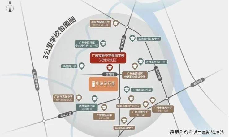 项目对面的浣花路有广东实验中学荔湾学校,该学校于今年9月正式开学,设有54个班级。附近还有其他优秀的学校,形成了浓厚的优质教育氛围。