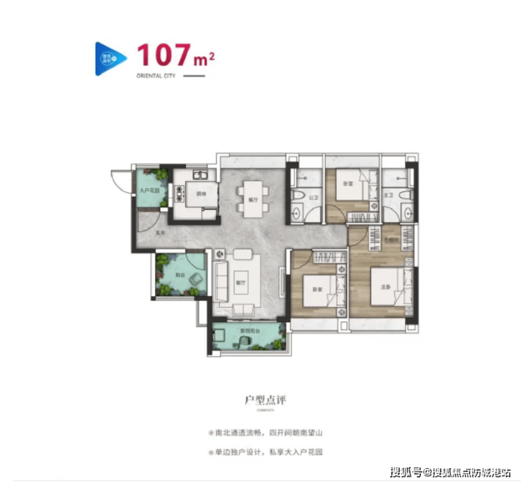 107㎡精装四房:改善型户型,四房两厅两卫,南北通透,动静分区明确,客厅与餐厅相连,空间开阔,适配改善型家庭或多人口家庭。