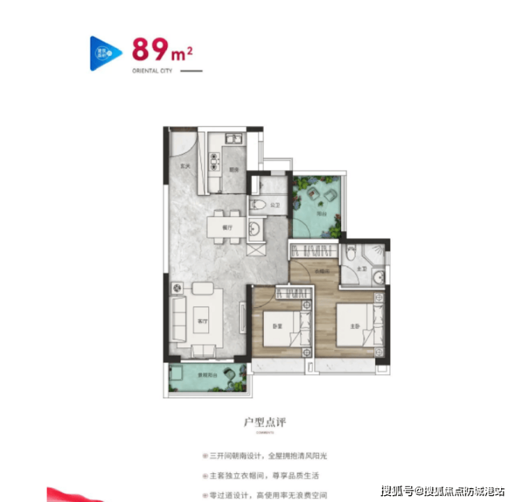 89㎡精装三房:主力刚需户型,三房两厅两卫,空间布局合理,主卧带独立卫浴,私密性强,阳台宽敞,可满足刚需家庭日常居住与储物需求。