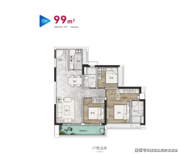 99㎡精装三房:舒适刚需户型,三房两厅两卫,客厅宽敞明亮,卧室空间充足,飘窗设计增加使用面积,适合人口较多的刚需家庭。