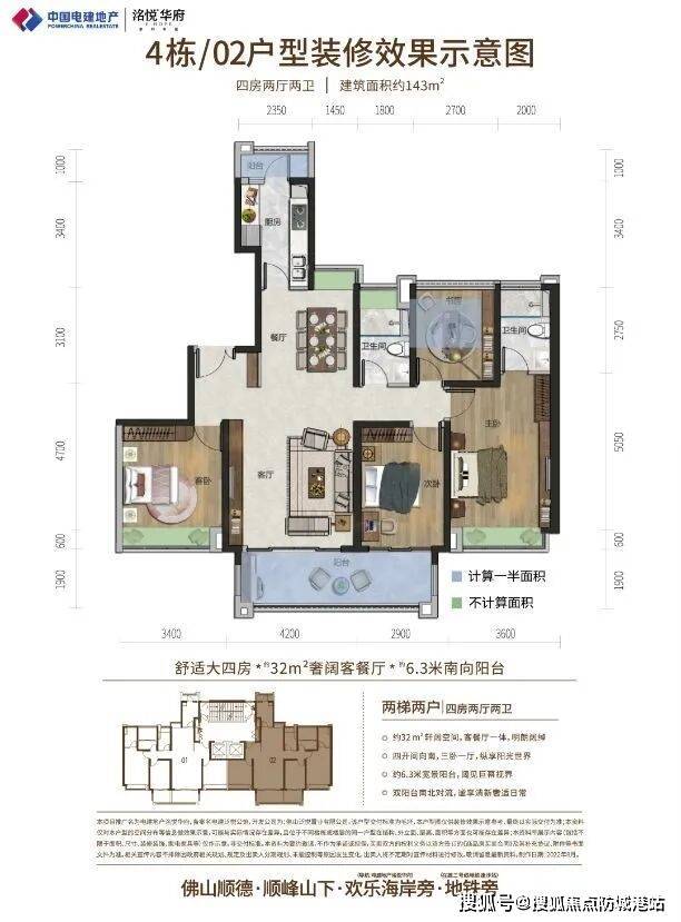 约32㎡轩阔空间,客餐厅一体,四开间朝南,三卧一厅。约6.3米宽景阳台可俯瞰中轴园林全景,双阳台配置保证南北对流,居住体验极佳。