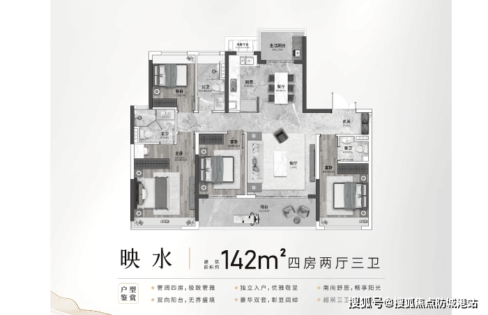 整体格局:2 梯 2 户低密梯户比、南北双向阳台、双主卧套房、动静分区、全屋通透
