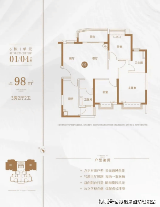 98㎡三房两厅两卫户型:户型布局方正,南北通透,采光通风效果极佳。客厅空间开阔,与景观阳台相连,延伸居住空间的同时,让业主尽享社区美景;三房设计可满足三口之家或三代同堂的居住需求,主卧配备独立卫生间,保障私密性;次卧空间灵活,可根据需求改造为儿童房、书房等;厨房与餐厅相邻,方便用餐与清洁,整体户型实用性强。