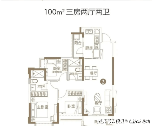 100㎡三房两厅两卫户型:该户型在98㎡户型基础上优化空间布局,增加储物空间,提升居住舒适度。客厅面宽较大,采光充足,搭配全景阳台,视野开阔,部分户型可远眺海景或湖景;主卧空间宽敞,配备独立衣帽间与卫生间,满足品质居住需求;次卧采光均匀,空间舒适,适合家庭成员居住;卫生间干湿分离,细节设计贴心,整体户型兼顾实用性与品质感。