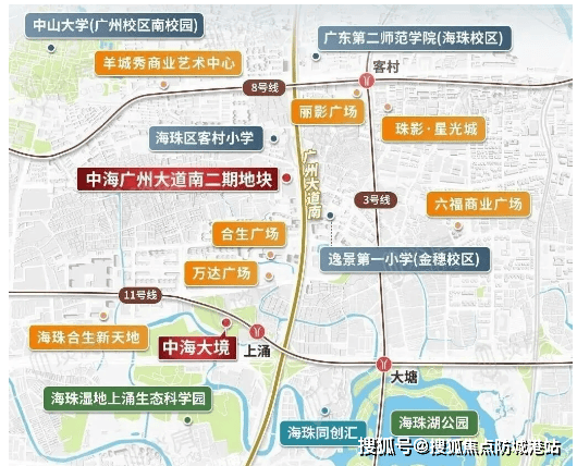 项目地理位置得天独厚,位于海珠区核心板块,坐落在广州城市新中轴线南段,这条中轴线先后诞生天河北、珠城两代CBD,如今往南延伸,“一塔一场四馆”等地标配套拔地而起,规格完全不输珠江新城,未来发展潜力无限。