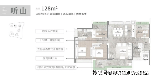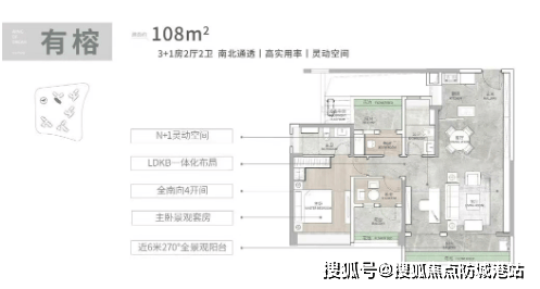 108㎡ 3+1房:近6米南向阳台,LDKB一体化,5.9米大方厅,主卧带L型衣帽间;