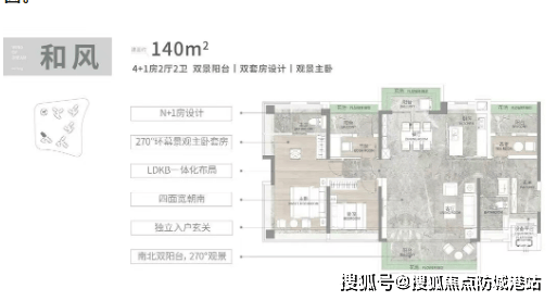 140㎡ 4+1房:南向采光面达15.7米,南北双阳台,主卧配270°折叠屏飘窗;
