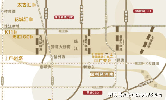 保利天奕落子于琶洲南区核心,北望广交会展馆,南接新滘路,西邻赤沙旧改片区,东靠科韵路,地理位置得天独厚。项目紧邻黄埔涌,与琶洲中区仅一水之隔,无缝承接西区互联网巨头(腾讯、阿里、唯品会等)与中区会展经济外溢的高净值人群。更重要的是,2024年广州发改委集中公告新建四条市政道路,全部聚焦琶洲南区,标志着该片区正式纳入琶洲整体开发版图,进入高速兑现期。