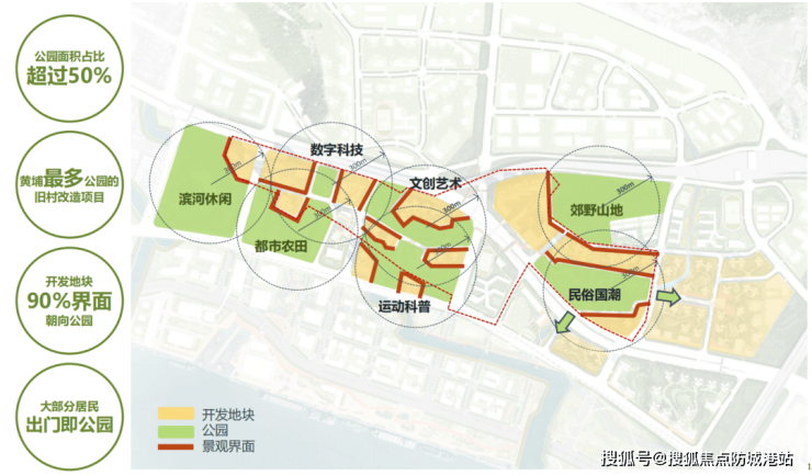 结合本土文化内涵塑造9个特色主题公园:海丝科技公园、都市农田公园、岭南艺境公园、沙浦国学公园、城市塑影公园、缤纷童趣公园、龙舟生态公园、远洋文化公园、桥畔运动公园。