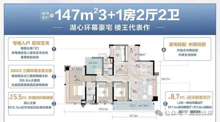 💡湖心环幕大四房,建面约147㎡四房两厅两卫