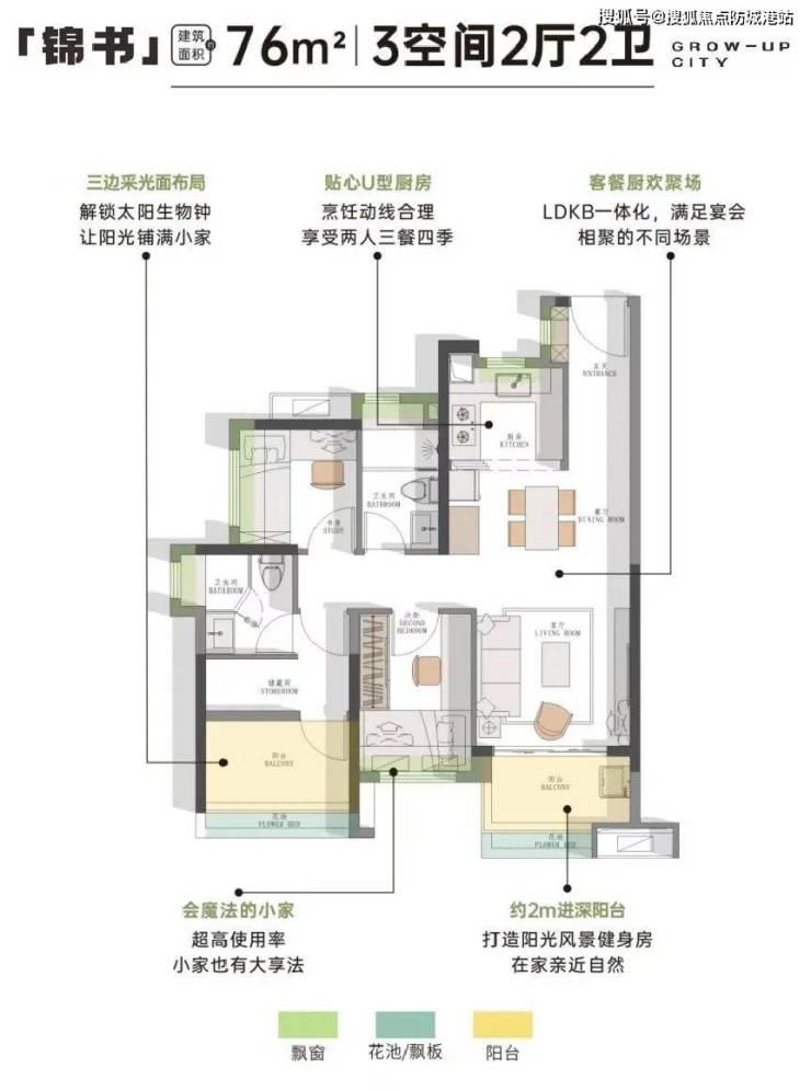 76㎡ 三房2厅2卫:南向三开间 约8.5m采光