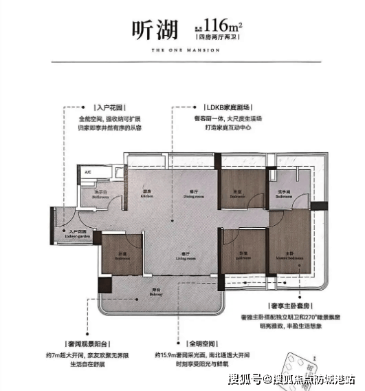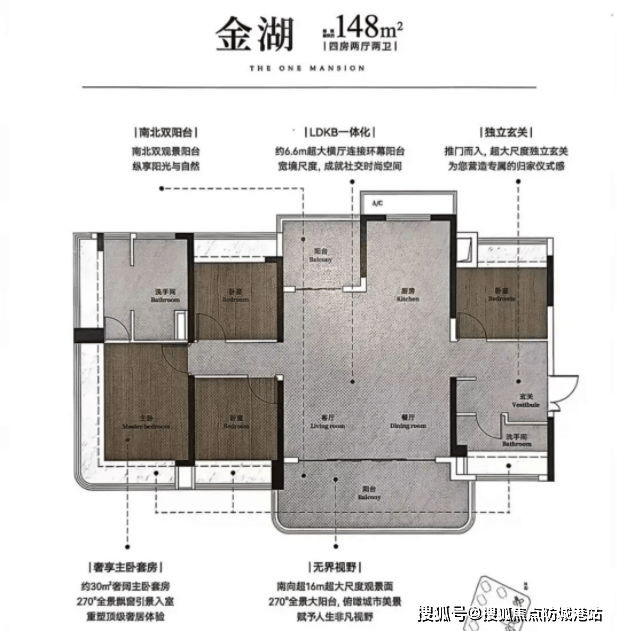 横厅南北对流设计,是该户型的另一大亮点,横厅设计让客厅更加宽敞、通透,南北对流则能保证室内的通风效果,让室内空气更加清新,避免闷热、潮湿的问题,尤其是在广州的夏天,南北对流的户型会更加舒适;约7米的长阳台连通客厅,不仅能增加室内的采光和通风,还能作为休闲空间,欣赏窗外的景色,甚至能看到金山湖的湖景,提升居住的品质感。