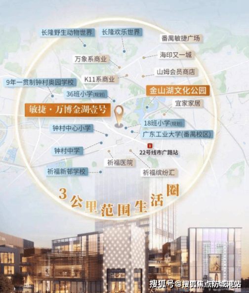 项目坐落于番禺万博CBD与金山湖生态走廊交汇处,属于万博CBD辐射圈核心,一边是万博CBD的商业、产业红利,一边是金山湖的生态资源,实现了“繁华与自然兼得”。距离地铁22号线市广路站实测约800米,2站可到万博中心,6站直达珠江新城,通勤便捷;同时,距离金山湖仅400米,步行就能到达,部分户型能直接看到湖景,居住环境优越,这种“近CBD+邻湖”的组合,在番禺乃至整个广州都十分稀缺,既适合刚需族通勤上班,也适合改善族追求居住品质。
