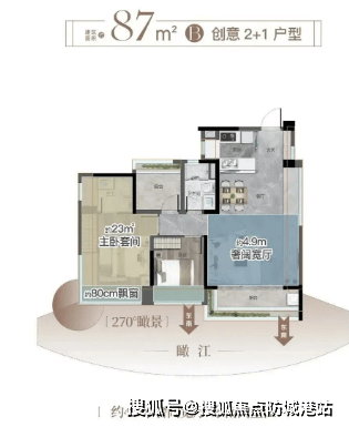 建面约87㎡A 户型做到了三房两卫,四开间朝南、南北通透,约 3.8 米的奢阔横厅连接观景阳台,推窗即揽园林盛景,部分房源还能望江,小户型也有大视野。同面积段的87㎡B 户型更是惊喜满满,罕见约 4.9 米宽幕客厅,搭配约 23㎡的酒店套房式主卧,自带独立卫浴和观景飘窗,占据央景中轴位置,居家舒适度直接拉满。