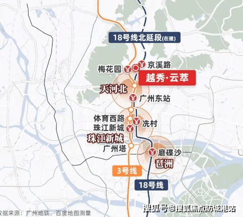首先是地铁,越秀·云萃是真正的双地铁楼盘,家门口就是18号线京溪路站。很多人会问,18号线到底有多方便?18号线是广州的快速地铁线路,速度快、站点少,业主下楼就能乘坐,无需换乘就能一线直达琶洲(磨碟沙站)、珠江新城(冼村站)、天河北(广州东站)、万博(南村万博站)等核心区域。