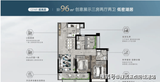 超高层96㎡三房户型:该户型设计紧凑实用,空间利用率高。客厅连接阳台,延伸了室内空间;主卧朝南,配备飘窗,采光充足;两个次卧面积适中,可灵活布置;卫生间干湿分离设计,提升了使用的便利性和卫生性。