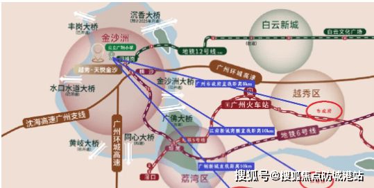 越秀·天悦金沙坐落于金沙洲板块,该板块横跨广州白云区和佛山南海区,临近荔湾,与广州主城区(如广钢新城、白鹅潭、白云新城等)距离适中,符合多数置业人群的通勤距离预期,是连接广佛两地的重要居住枢纽。