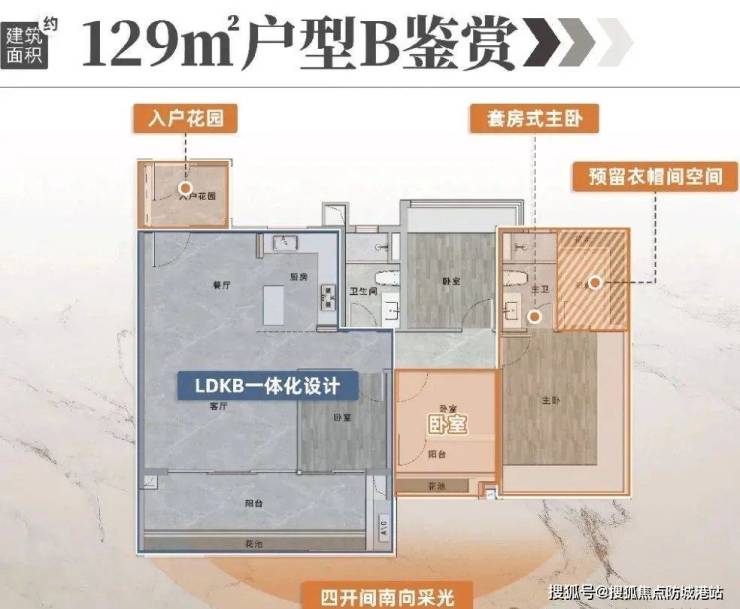 约129㎡户型B,四开间南向采光,客厅开间最高约达6米!搭配同为约6米的阳台,室内空间感直接撑大至IMAX级尊享!LDK餐客厅一体化,厅卧即可合并做成无界大方厅,也可以灵活设计成两个多功能间或次卧。