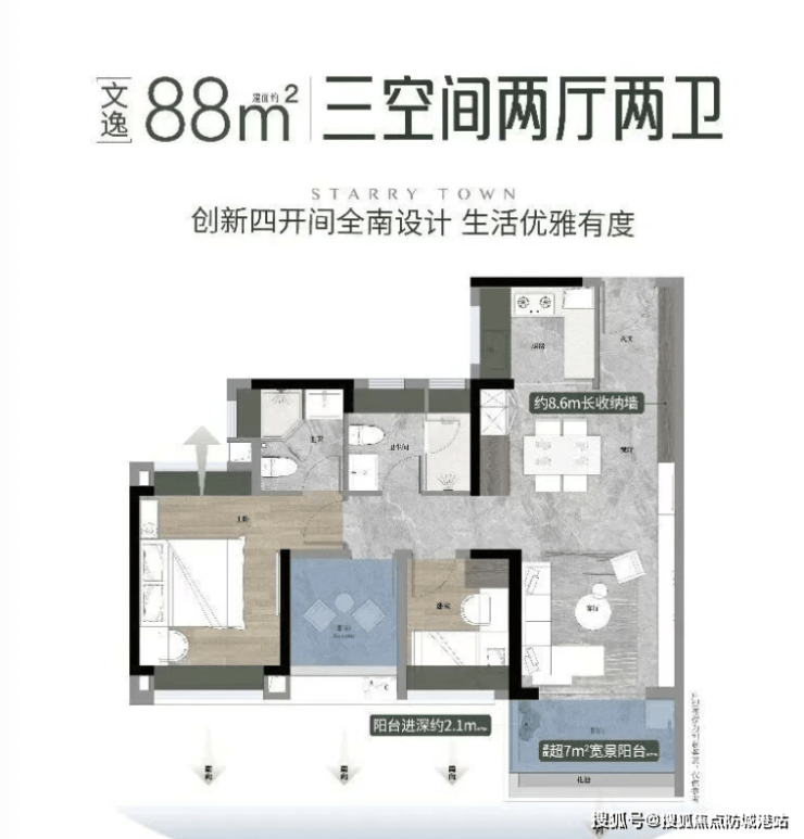 一、88㎡南向三房两厅两卫:刚需神户型,收官绝版,南向全明