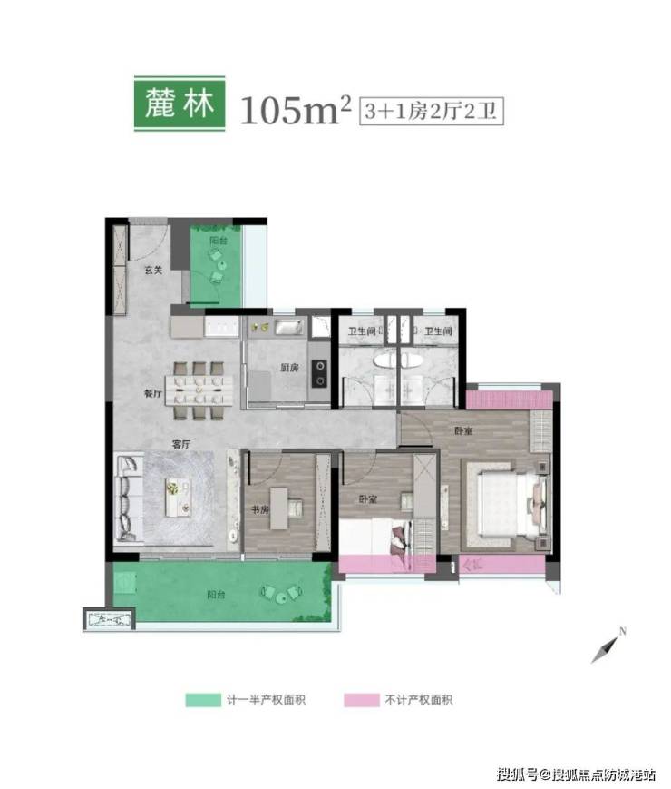 105㎡ 3+1房两卫:近12米南向采光,适合家庭一步到位的选择。