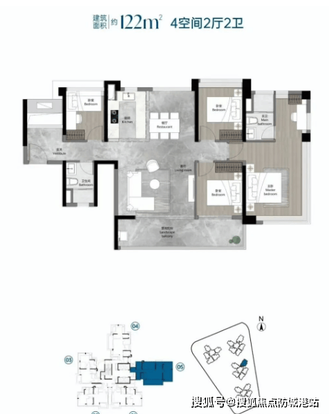122㎡四房两厅两卫:大面宽阳台+主卧套房设计,高层单位可享珠江后航道一线江景。
