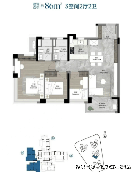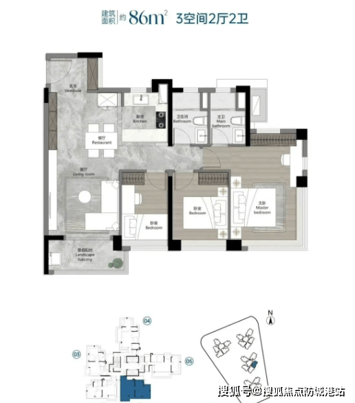 86㎡三房两厅两卫:做到四开间朝南,阳台占比达套内面积20%,主卧带飘窗,采光通风俱佳,小面积实现高功能;