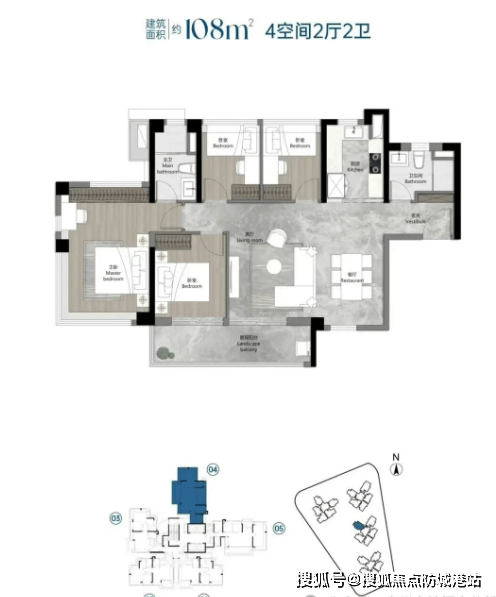 108㎡四房两厅两卫:LDK一体化设计,南北通透,兼顾家庭互动与私密性;