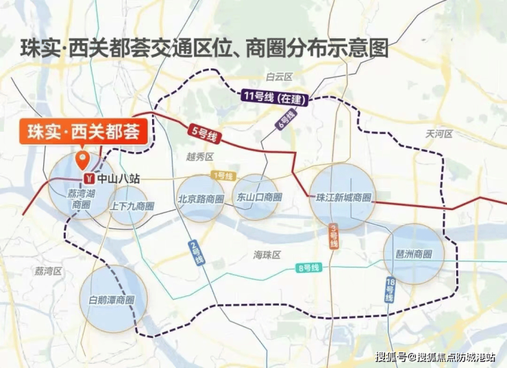 11号线作为广州首条地铁环线,贯通越秀、荔湾、天河、海珠、白云五大核心区,一线直达琶洲、白鹅潭、广州东站、火车站等战略要地。