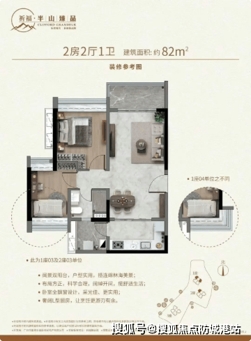 建筑面积约82平方米的两房两厅一卫,是专为追求品质生活的年轻夫妇或三口之家打造的理想居所。该户型布局方正,科学合理,没有丝毫面积浪费。最大的亮点是实现了阔景双阳台设计,这在同面积段产品中极为罕见。一个阳台与客厅相连,作为观景和会客空间的延伸,可以饱览连绵的林海美景;另一个生活阳台则紧邻厨房,方便晾晒衣物和收纳杂物,实现了功能与休闲的完美分离。奢阔的L型厨房设计,动线流畅,洗、切、炒一气呵成,让烹饪成为一种享受。两个卧室均带有飘窗设计,不仅增加了室内的采光面,更可将其打造为舒适的坐塌或实用的储物空间,大大提升了户型的实用性与趣味性。