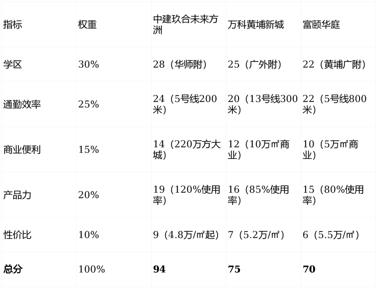竞品对比:与万科黄埔新城、富颐华庭相比,本项目学区、户型、价格优势更突出(详见“全能型住宅价值评分表”)。