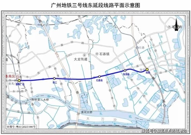 广州地铁3号线东延段全长9.55公里,全为地下线路,起于既有运营的地铁3号线番禺广场站(不含),沿亚运大道向东延伸至海傍站。共设车站4座车站,分别为傍江站、石碁南站、海涌路站、海傍站。