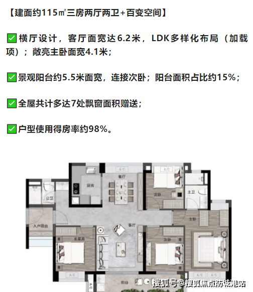 115㎡三房两厅两卫 + 百变空间:得房率约 98%,横厅设计,客厅面宽达 6.2 米,景观阳台面宽约 5.5 米连接次卧;阳台面积占比约 15%,7 处飘窗赠送,主卧面宽 4.1 米,居住体验堪比大户型,适配三代同堂家庭。