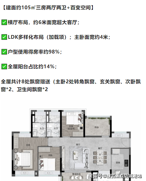 105㎡三房两厅两卫 + 百变空间:得房率约 98%,横厅布局,客厅面宽约 6 米,LDK 多样化布局;主卧面宽约 4 米,全屋阳台占比约 14%,8 处飘窗赠送,空间开阔,适合改善型家庭;