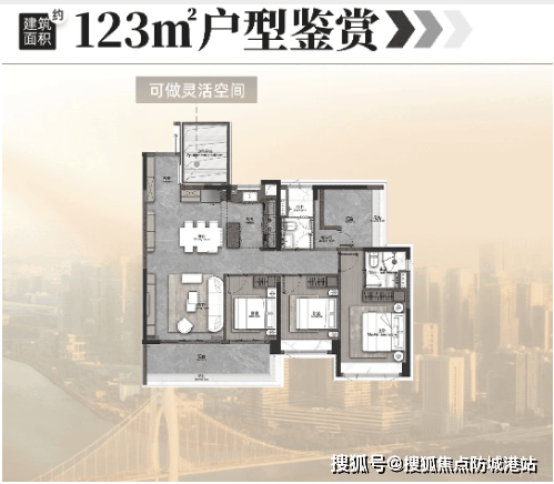 123㎡户型:创新性地打造了4+1房,每个空间都有足够的舒适感。四开间朝南,双面宽景观阳台长约6.5米,室内采光通风畅意。特别的是,“魔方空间”设计,如设备空间、厅卧都可做灵活空间,相当于在三房基础上再多两个多功能室,这在同面积段户型中较为罕见。