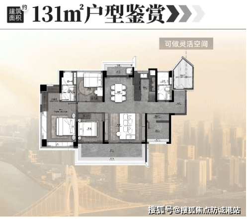 131㎡户型:南北对流双阳台,南向阳台长约7.5米,搭配LDKG一体化设计,突破空间局限,拓宽了娱乐、互动、社交等多维场景。主套L型衣帽间、环幕大飘窗,躺在床上便能欣赏窗外的“巨幕4K景观大片”。