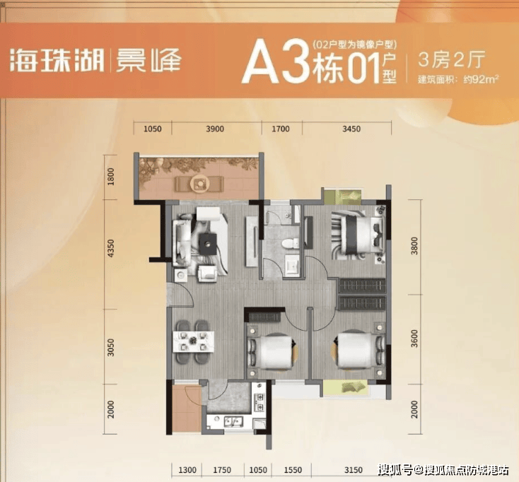 87–92㎡三房:动静分区清晰,客厅连接阳台,次卧可灵活改造为儿童房或书房;
