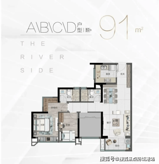 91㎡三房户型:作为项目主推户型之一,该户型总价低至168万起,性价比极高,适合对空间需求稍高的刚需家庭。户型采用南北通透设计,搭配全南向采光,通风采光效果极佳,部分高层房源可直接观赏砺江江景,景观优势显著。客厅空间宽敞明亮,连接超大阔景阳台,江景、园景尽收眼底;主卧空间开阔,配备步入式衣帽间与独立卫生间,提升居住品质;另外两间卧室空间充足,可满足老人同住或儿童成长需求,厨房配备预留储物空间,收纳能力强劲,整体户型布局科学,无浪费空间,实现居住舒适度与实用性的完美平衡。