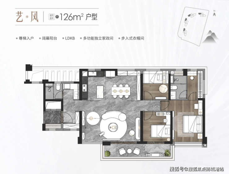 中海麓府主推建面约126平方米至170平方米的三至四房户型,全部采用两梯三户的设计,且每户均配备独立电梯厅,实现了尊梯入户的私密体验。以建面约126平方米的三房户型为例,其空间布局强调功能性与伦理性的平衡。进门处设有独立的玄关缓冲空间,LDKB(客厅、餐厅、厨房、阳台)一体化设计使得公共活动区域显得尤为开阔,阔幕阳台不仅延伸了室内视觉空间,也提供了充足的晾晒与休闲场地。该户型特别规划了多功能独立家政间,解决了清洁工具收纳及洗衣烘干等家务动线问题,同时主卧配备步入式衣帽间,提升了居住的舒适度与仪式感。
