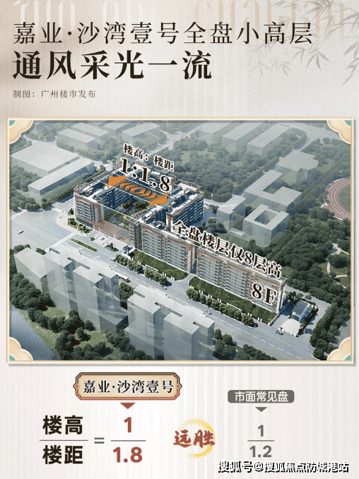 第一大理由:稀缺低密度小高层,居住舒适度拉满。当下广州多数新盘为追求货值,多规划高层或超高层建筑,容积率普遍在2.5以上,居住拥挤、采光不足、私密性差等问题突出。而嘉业沙湾壹号不惜牺牲货值,规划12栋8层纯小高层洋房,容积率仅1.8,全盘仅242户,最大楼距可达60米,遮阳楼高度与楼距比例达1:1.8,远胜市场常规水平,部分楼栋为单排板楼设计,南北对流效果极佳,前后无视线遮挡,每一户都能拥有充足的采光和开阔的视野,彻底告别高层拥挤困扰,享受低密度社区的静谧与舒适。