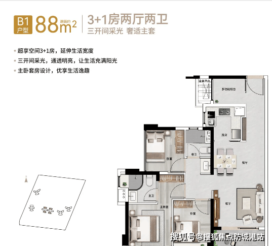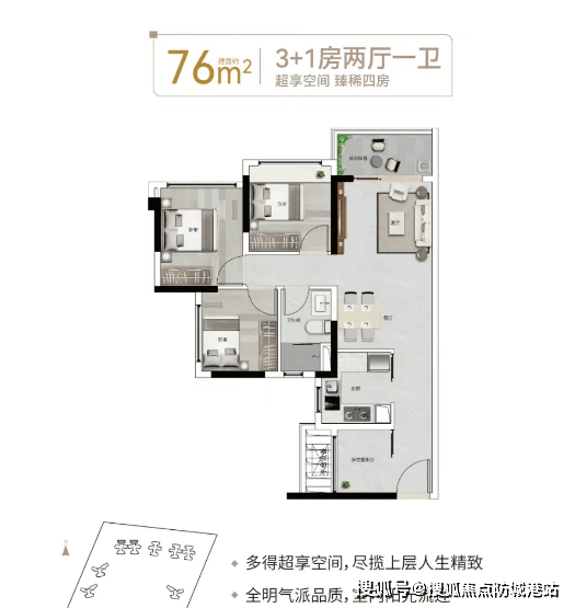 项目推出多种户型,满足不同家庭需求。以76㎡3 + 1房2厅1卫户型为例,餐厅与客厅连通布局,空间开阔,虽为低总价户型,却实现功能最大化,满足刚需家庭对空间的需求,让有限空间发挥无限可能。