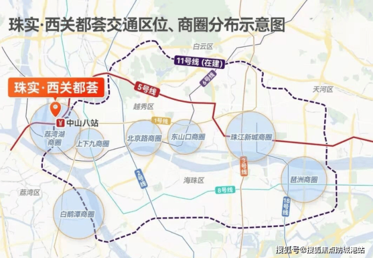项目距地铁5号线与11号线换乘站中山八站仅约500米,步行6分钟即可抵达,堪称“地铁上盖”楼盘。其中,地铁5号线是广州的核心交通干线,搭乘5号线20分钟就能直达珠江新城,轻松对接天河CBD,对于在珠江新城上班的上班族来说,通勤十分高效,不用再忍受漫长的通勤时间,每天可以多睡半小时。而已经正式开通的地铁11号线,作为广州首条环线,串联起天河、海珠、荔湾、白云等多个区域,连接五大CBD,形成“黄金通勤圈”,未来无论是去琶洲、金融城还是白云新城,都十分便捷,大大提升了出行效率。