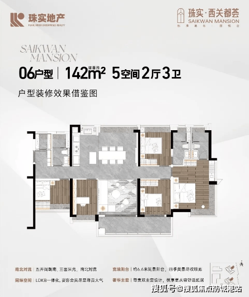 建面约142㎡5房2厅3卫则面向改善家庭,主打大宅布局,能够满足多代同堂的需求。这款户型空间开阔,功能分区完善,每个房间都有充足的空间,不会显得拥挤,适合三代同堂、四代同堂的家庭居住,家人之间既有独立的私人空间,又能随时陪伴在身边。部分房源还能享受珠江视野,站在阳台上就能欣赏到珠江的美景,提升了居住质感和幸福感。户型采用南北对流板式设计,打造5空间双主套,有开放式餐厨空间可放置大圆桌,定制的玲珑岛台串联烹饪区与用餐区,既实用又大气,能够满足改善家庭对高品质居住的需求。