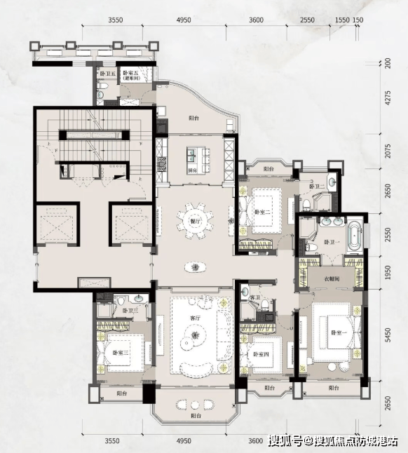 项目主力户型为236㎡(A3)、263–264㎡(A2)、317㎡(A1)及398㎡(特A)五房大平层,均采用“十字中轴九宫格布局”,层高3.47–3.57米,客厅开间4.5–9.5米,江景观赏面宽达15–16米以上,部分户型更设外飘休闲厅、水吧、工人套房,功能极致完备。