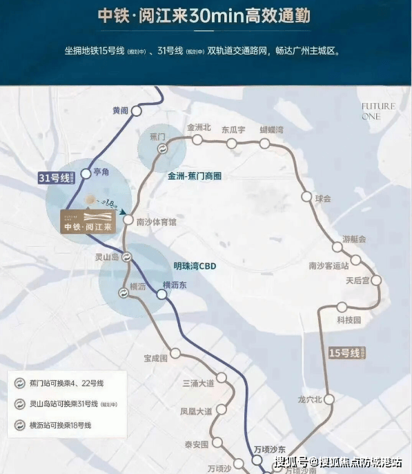 ◦交通价值:多维立体交通网络,快速通达湾区核心,出行高效便捷广州市南沙区人民政府。地铁:距离已开通 4 号线蕉门站约 3 公里,公交接驳 15 分钟直达,30 分钟到番禺广场、1 小时到珠江新城;规划 15 号线体育馆站紧邻项目,未来接驳 18、22 号线,横沥站到广州东站仅 25 分钟,实现湾区 1 小时生活圈广州市南沙区人民政府。公交:小区配建公交首末站,下楼即乘,直达蕉门地铁站、横沥岛、南沙中心、万达广场,日常通勤、购物无忧。自驾:紧邻进港大道、万洲大桥、广澳高速、南沙港快速,自驾 15 分钟到南沙自贸区、20 分钟到虎门大桥、40 分钟到深圳、60 分钟到东莞、佛山,无缝连接粤港澳大湾区各大城市广州市南沙区人民政府。轨道交通:邻近庆盛高铁站、南沙港铁路,便捷通达香港、澳门及全国主要城市,交通枢纽属性凸显广州市南沙区人民政府。