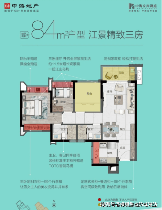 1. 三房两厅一卫(约84㎡):该户型为项目主力刚需户型,适合三口之家居住,紧凑实用,空间利用率高,总价适中,是刚需家庭的首选户型。入户设有独立玄关,可放置鞋柜、收纳柜等,提升空间利用率,同时保障室内私密性,彰显归家仪式感;客厅方正宽敞,连接南向全景阳台,采光通风极佳,阳台视野开阔,可俯瞰社区景观,客厅可作为休闲、娱乐、用餐的多功能空间,满足日常家庭互动需求;餐厅与客厅相连,动线流畅,方便日常用餐,同时预留餐桌位置,适配小家庭用餐需求。
