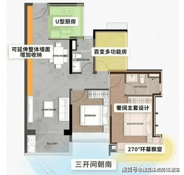 123㎡奢阔四房:约26㎡南北对流主卧套房、4.5开间朝南,并配备金融岛罕见的阳光玄关,还可灵活改造为双套间格局。