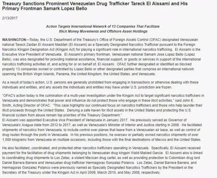 去年2月13日,美国财政部发布声明称经过调查认定,委内瑞拉的副总统塔雷克·埃尔·艾萨米涉嫌参与毒品走私、洗钱、贪污,美方决定对其进行制裁。